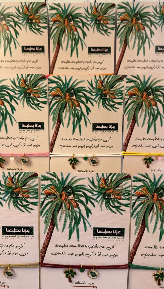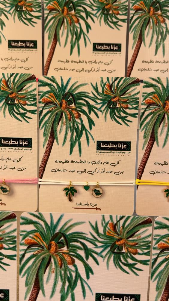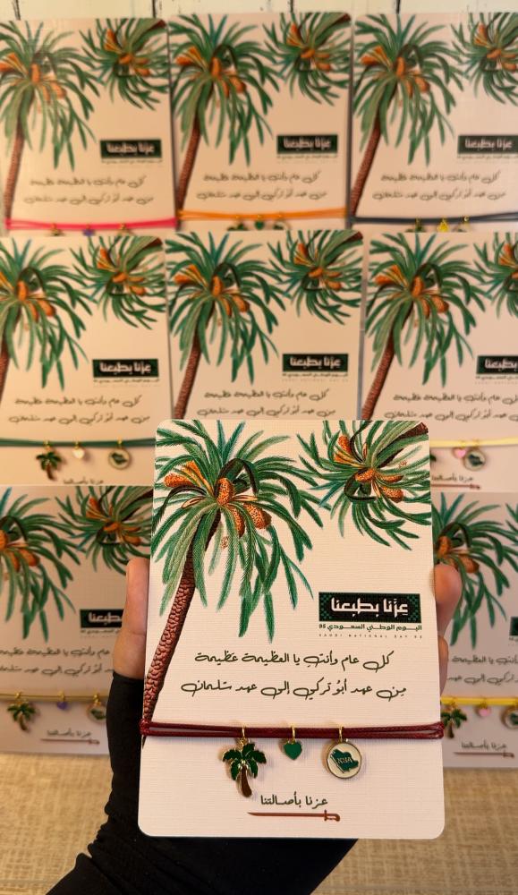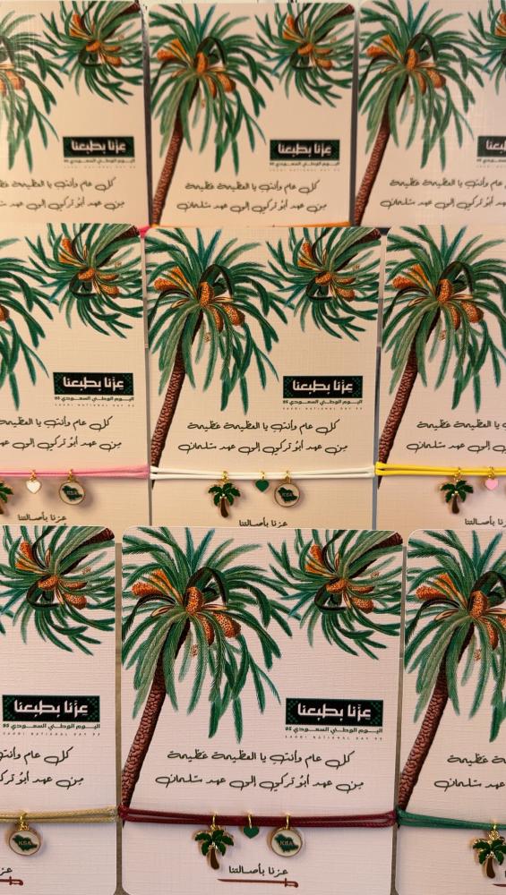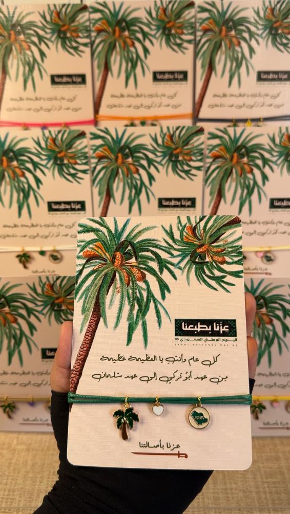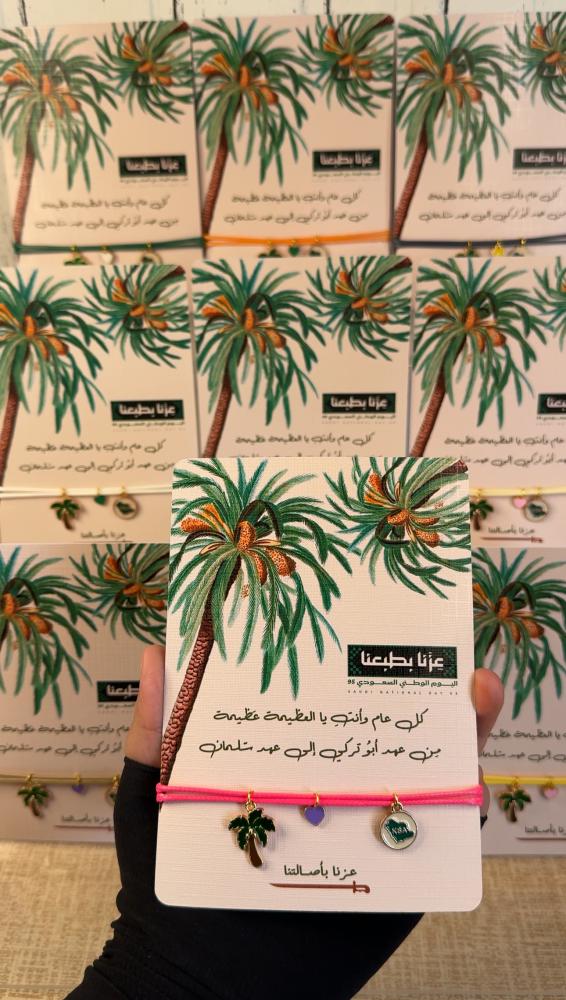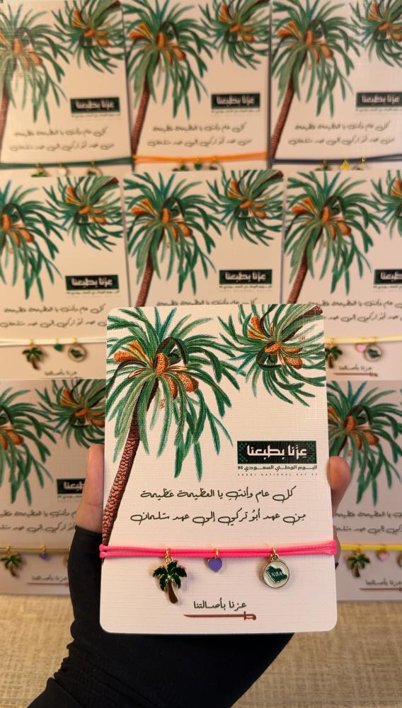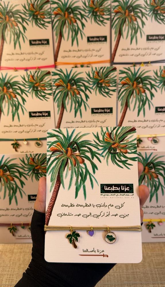 كما تمدّ النخلة جذورها عميقًا في الأرض وتمنح ثمارها بلا انقطاع ، كذلك هي المرأة السعودية.. أصيلة في قيمها، راسخة في جذورها، وعطاؤها لا ينضب🌴 في اليوم الوطني 95 ✨صنعنا هذا السوار يدوياً ! ليكون رمزًا لعزنا وفخرنا: النخلة تمثل المرأة ، القلب ينبض بحب الوطن ، الخريطة تجمعنا تحت راية السعودية🇸🇦💚