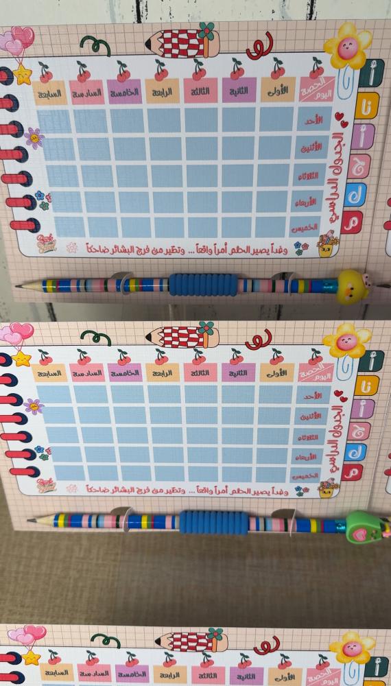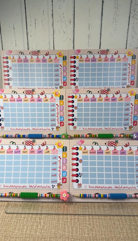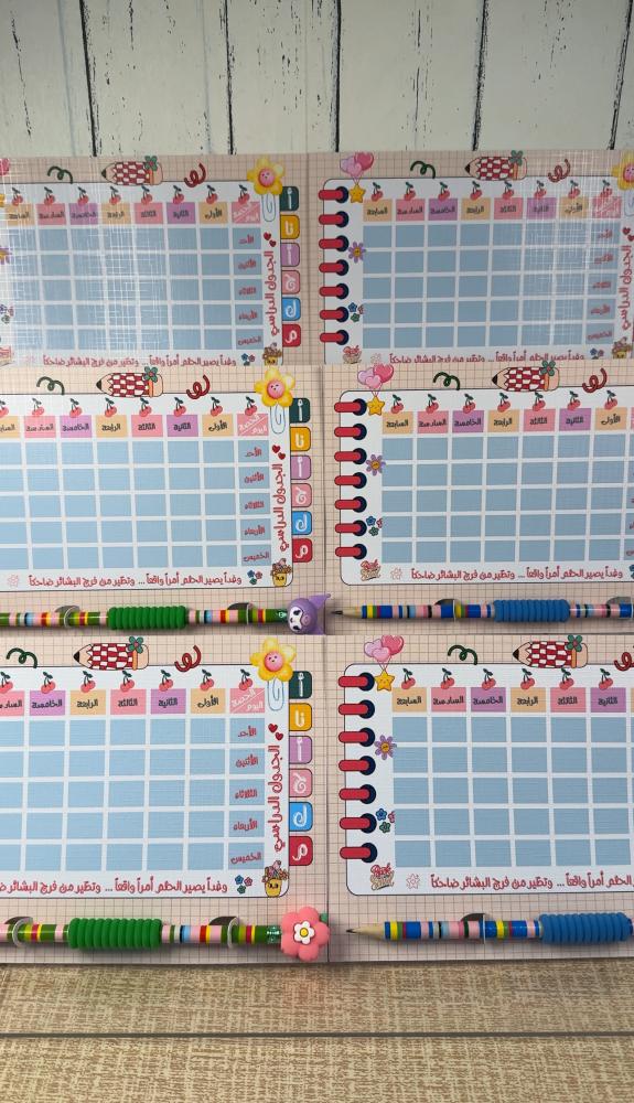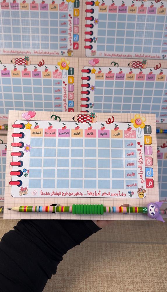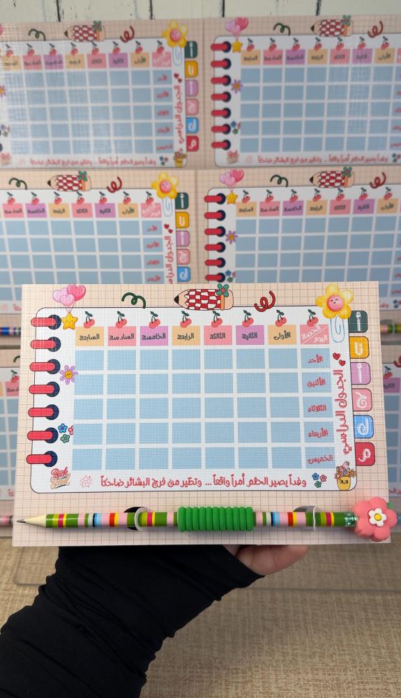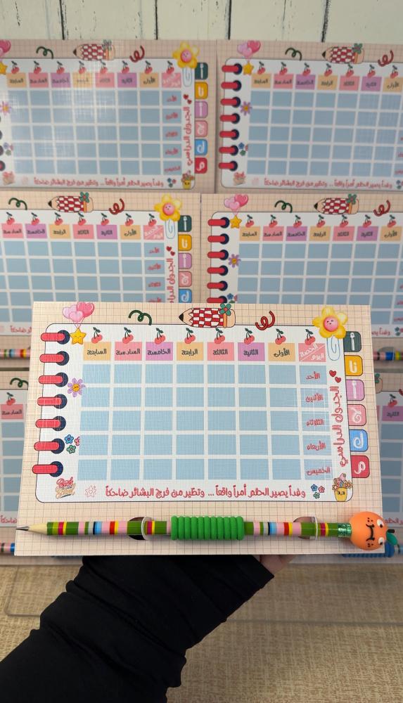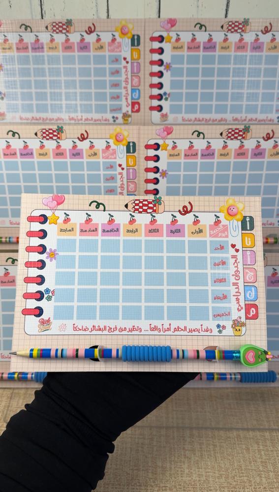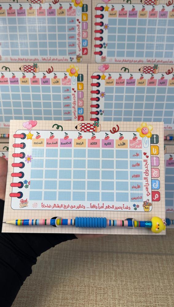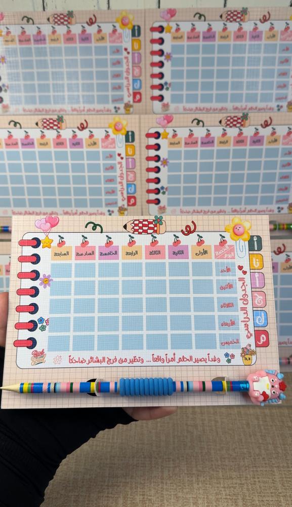 توزيعات تحفيزية للطلاب تحتوي على جدول دراسي ملوّن يساعد في تنظيم الوقت⏰مرفق بمرسام ذو تصميم كرتوني لطيف وإسفنجة تخفف الضغط على الأصابع وتسهل الكتابة لتشجيعهم على التخطيط والالتزام بطريقة ممتعة وجذابة👏📚✏️